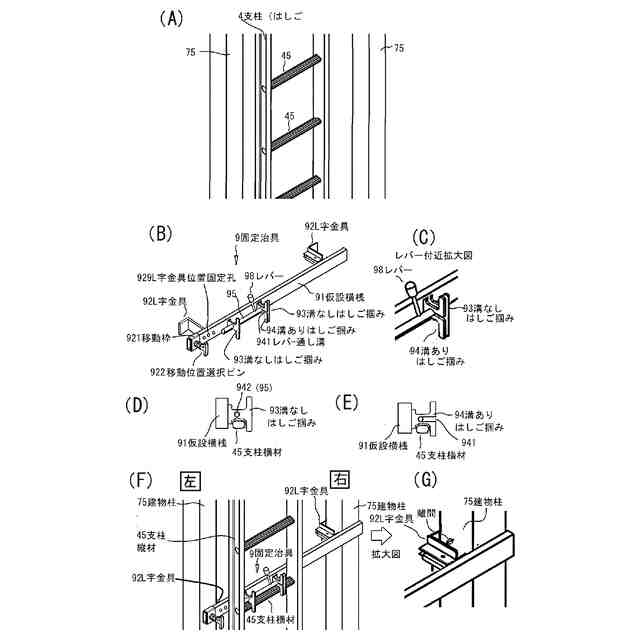 図4は支柱(はしご)を建物柱に固定する固定治具の説明図である。図4(A)は固定治具取付前の支柱(はしご)の斜視図である。図4(B)は固定治具の斜視図である。図4(C)は、レバー付近の拡大図である。図4(D)は溝なしはしご掴みと支柱横材との関係の説明図である。図4(E)は溝ありはしご掴みと支柱横材との関係の説明図である。図4(F)は、支柱(はしご)に固定治具を載せた状態の斜視図である。図4(G)は図4(F)の一部拡大図であり、右の建物柱とL字金具の状態の説明図である。