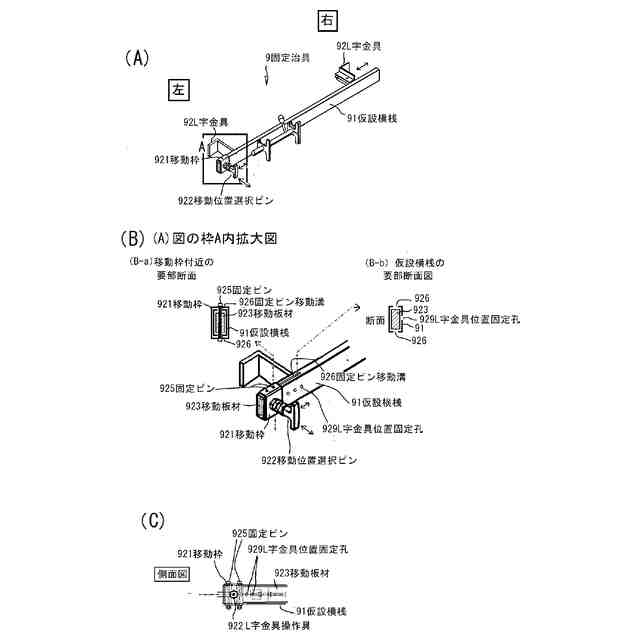 図6は(支柱設置工程4)で使われる移動位置選択ピンの説明図である。図6(A)移動位置選択ピンがある固定治具左側の外観斜視図である。図6(B)は、図6(A)に付した枠A内拡大図である。図6(C)は移動枠921付近の側面図である。