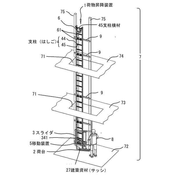 図1は地上階に建築資材(サッシ)がある実施例1の荷物昇降装置の斜視図。