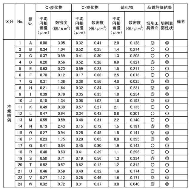 更に、高冷間加工性の冷間工具鋼において、炭化物の平均円相当径や介在物の清浄度を規定して、冷間加工性と被削性を向上した鋼が提案されている(特許文献2)。しかしながら、炭化物の平均円相当径を0.25μm以上0.8μm以下とすることで、低硬度により被削性と冷間加工性を向上させる提案である。炭化物の平均円相当径が0.8μm超の粗大炭化物が工具摩耗促進により被削性を劣化させることに関しては述べられておらず、炭化物の平均円相当径が0.25μm未満の場合、硬さが高く、被削性向上の効果が得られないとされている。また、切削表面性状に関しては述べられていない。