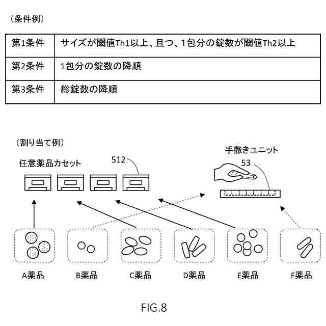 図8は、図7に示す処理における第1~第3条件の例、及び、分包対象の薬品の任意薬品カセット及び手撒きユニットへの割り当て例を示す図である。