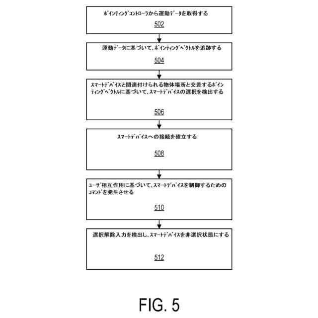 【解決手段】ユーザによって装着されるポインティングコントローラは、種々の接続されるスマートデバイスの直感的制御を可能にする。ユーザは、スマートデバイス(又は代理物体)の方向をポイントし、制御のためのデバイスを選択するための所定のアクションを実施することによって、制御されるべきデバイスを示し得る。いったん選択されると、ユーザは、種々のジェスチャもしくはポインティングコントローラに統合された1つまたはそれを上回る制御要素との相互作用を実施することによって、スマートデバイスと相互作用し得る。スマートデバイスは、スマートデバイス上の視覚または聴覚インジケータを使用して、もしくは触覚、聴覚、又は視覚的フィードバックを提供する、ユーザに近接するポインティングコントローラもしくは他のデバイスに制御信号を送信することによって、フィードバックを提供し得る。