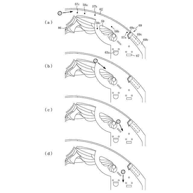 (a)は、返しゴムが突出位置に位置している状況において、右打ち遊技で発射された遊技球が突出位置に向かって移動している状態を示した図であり、(b)は、(a)の状態から、返しゴムが通常位置に向かって流入経路を移動している状況において、突出位置を通過した遊技球が返しゴムの第1衝突面と衝突した状態を示した図であり、(c)は、(b)の状態から、通常位置に向かって移動している返しゴムが開口位置に到達し、返しゴムと衝突した遊技球が第1衝突面と接した状態で流入経路を転動している状態を示した図であり、(d)は、(c)の状態から、通常位置に向かって移動している返しゴムが上側経路を移動しており、返しゴムと接しながら流入経路を転動していた遊技球が下側経路に流入した状態を示した図である。