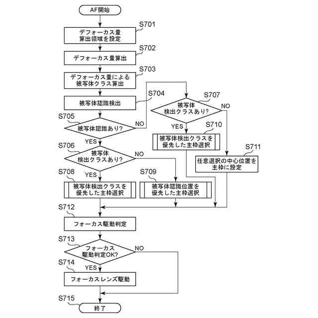 また、特許文献2では、被写体認識機能を備え、被写体認識領域から得たデフォーカス量が所定以下だった場合、そのデフォーカス量を用いてフォーカスレンズを制御して被写体に合焦させ、被写体認識領域から得たデフォーカス量が所定以上だった場合、AF枠といった被写体認識領域以外の領域から得られるデフォーカス量を用いてフォーカスレンズ制御を行う。撮影画面の表示に関するものとして、特許文献3では、特許文献2と同様に被写体認識領域から得たデフォーカス量が所定以下だった場合、AF枠を非表示にして被写体認識領域を示す枠を表示させ、被写体認識領域から得たデフォーカス量が所定以上だった場合、AF枠を表示させて被写体認識領域を示す枠を非表示にする。