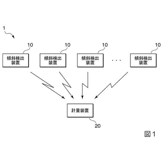 販売処理システム1は、複数台の傾斜検出装置10と、計量装置20とを含む。夫々の傾斜検出装置10と、計量装置20とは、通信可能に接続されている。なお、本例では、設置されたときの見た目を考慮し、無線(例えば、無線LAN(Local Area Network)、Bluetooth(登録商標)等)により接続される例を説明するが、有線により通信可能に接続されるようにしてもよい。