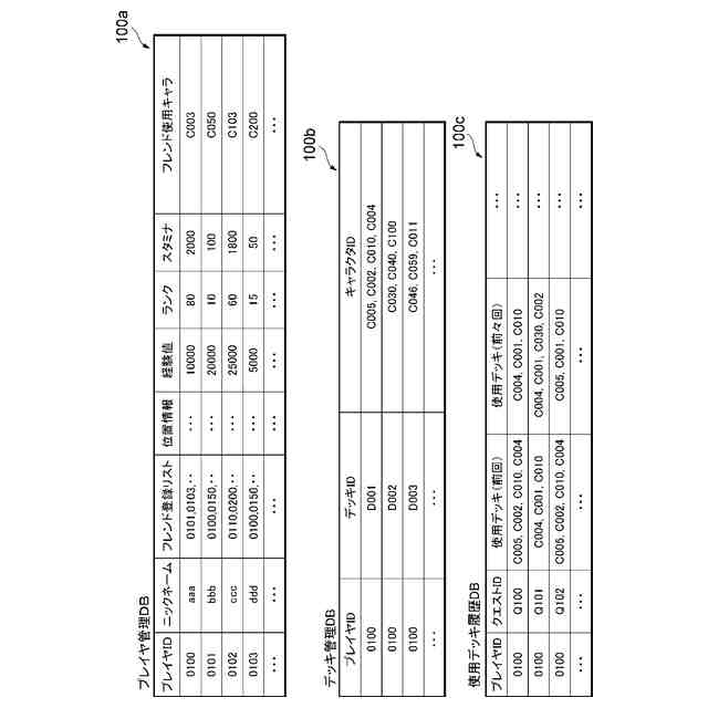 プレイヤ管理DB、デッキ管理DB及び使用デッキ履歴DBの一例を示す図 である。