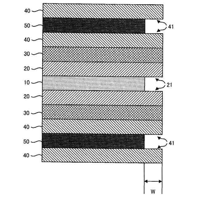 前記露出部において前記積層面に沿う幅方向の長さが、0μmより大きく50μm以下である、