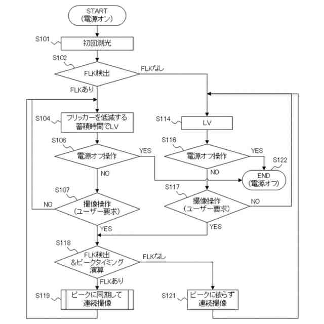 本発明は、フリッカー環境下での連続撮像等において記録用撮像の間隔が長い場合の露出追従性を改善することができる。
