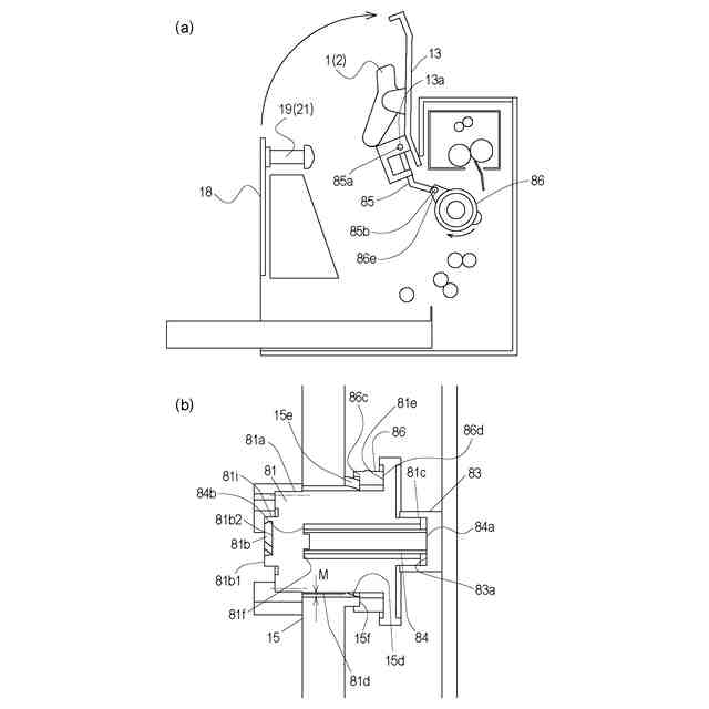 この画像形成装置の駆動伝達部材は、画像形成装置本体の開閉扉を閉じた際に、バネによって押圧されてプロセスカートリッジ側に移動する。そうすることで駆動伝達部材がプロセスカートリッジのカップリングに係合(カップリング)し、プロセスカートリッジに駆動伝達ができるものである。また、画像形成装置本体の開閉扉を開いた際に、カムにより駆動伝達部材がバネに抗してプロセスカートリッジから遠ざかる方向に移動する。そうすることで駆動伝達部材がプロセスカートリッジのカップリングとの係合(カップリング)を解消し、プロセスカートリッジを画像形成装置本体に対して取り外し可能な状態にすることができるものである。