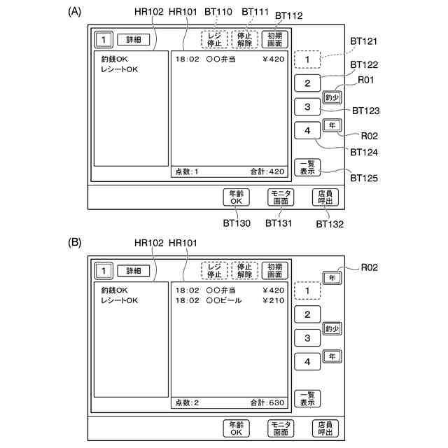 取引状況管理装置30は、店舗内に設置されている装置を管理(処理状況、動作状況等を監視、制御等)する装置(例えば、パーソナルコンピュータ)である。取引状況管理装置30は、少なくとも、CPU、記憶部、表示部(タッチパネルとして構成してもよい)、操作部(キーボード、マウス等)、通信部を備える。取引状況管理装置30は、印刷装置(非図示)と通信可能であり、種々の情報を印刷装置から出力してもよい。取引状況管理装置30は、店員によって使用される。