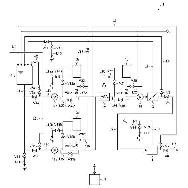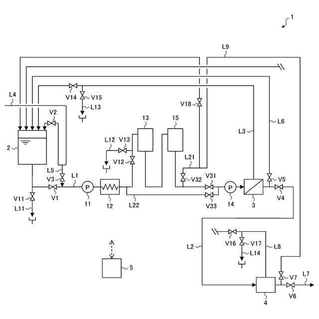 上述した純水製造装置の殺菌方法として、膜分離装置と電気式脱イオン水製造装置に一括して熱水を通水して殺菌する方法がある。この方法には、膜分離装置と電気式脱イオン水製造装置を個別に殺菌する場合に比べて、水使用量や工程数を削減することでより効率的な殺菌処理が可能になるというメリットがある一方、次のようなデメリットもある。すなわち、殺菌処理中に膜分離装置に対して通常運転時と同等の供給圧力で熱水を供給することができず、したがって、通常運転時と同様の膜分離処理が行えないため、電気式脱イオン水製造装置に対する給水の水質基準を満たさなくおそれがある。そこで、特許文献1には、純水製造装置で製造された純水を加熱して系内に通水する方法が記載されている。具体的には、純水製造装置で製造された純水を原水タンクに一旦貯留し、その純水を加熱して膜分離装置と電気式脱イオン水製造装置に順次供給した後に原水タンクに還流させることで、熱水を系内で循環させる方法が記載されている。この方法によれば、加熱殺菌用の熱水として純水製造装置で製造される純水が用いられるため、殺菌処理中の電気式脱イオン水製造装置へのイオン負荷を軽減することが期待される。