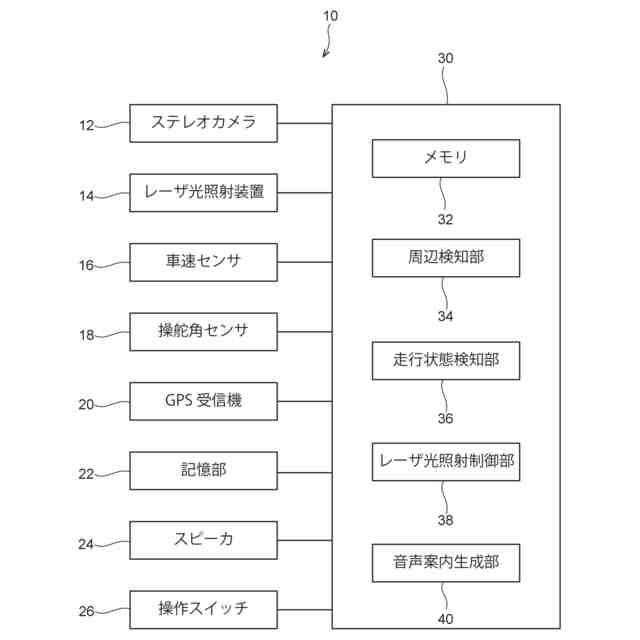 図1及び図2に示されるように、運転支援装置10は、撮像部としてのステレオカメラ12と、レーザ光照射部としての左右一対のレーザ光照射装置14と、車速センサ16と、操舵角センサ18と、GPS受信機20と、記憶部22と、報知部としてのスピーカ24と、操作スイッチ26と、制御部30と、を備えている。以下、運転支援装置10の各構成について説明する。
