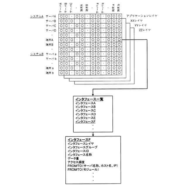 コンピュータが、システムを構成する構成要素ごとに設計されたインタフェース情報に応じて、当該構成要素内または当該構成要素間のインタフェースの仕様を、共通するレイヤごとに一覧表示する