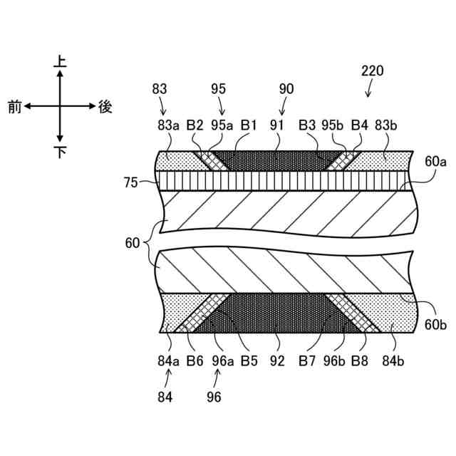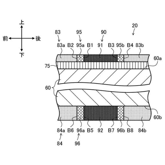 各々が前記緻密層、前記中間層、前記多孔質層のうち互いに接する2層の境界部である複数の境界部のうちの少なくとも1つは、前記前端側または前記後端側への傾斜を伴って前記側面に接近するように延在している、