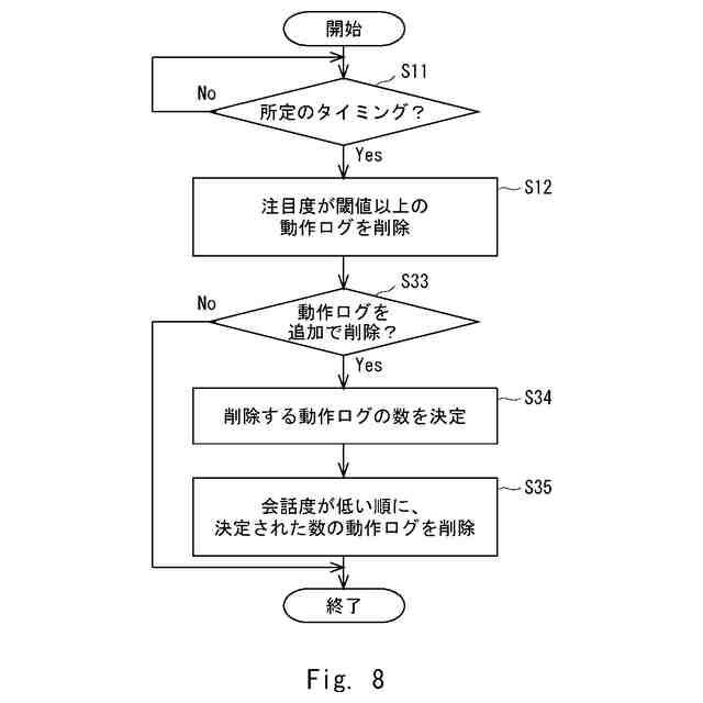 前記記録制御部は、前記所定のタイミングになると、前記会話度情報が示す会話度が低い順に前記動作ログを、前記記録部から削除する、