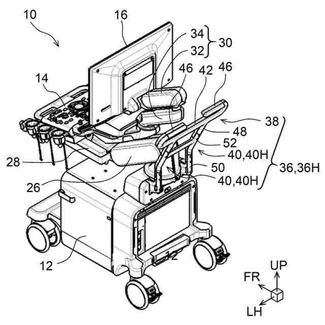 【解決手段】超音波診断装置の手押しハンドル36は、グリップ部46を有するハンドルトップ38と、上端がハンドルトップ38に固定され、下端が装置本体に固定されたハンドル支柱40とを備える。ハンドル支柱40は、ハンドルトップ38と一体となった支柱上部部材54と、装置本体に設けられた支柱下部部材56と、上端部において支柱上部部材54と着脱可能に結合し、下端部において支柱下部部材56と着脱可能に結合する支柱中間部材58とを含む。支柱上部部材54と支柱下部部材56は、支柱中間部材58を介さずに直接結合可能である。支柱上部部材54と支柱下部部材56が支柱中間部材58を介して結合した状態では手押しハンドル36の高さは高くなり、支柱上部部材54と支柱下部部材56が直接結合した状態では手押しハンドル36の高さが低くなる。