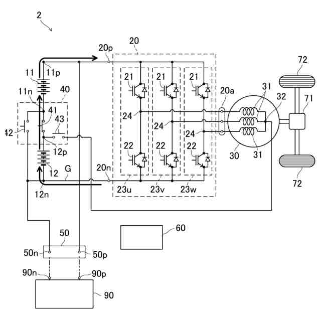 コントローラは、第1バッテリと第2バッテリでモータを駆動する場合は直列状態となるように回路セレクタを制御する。このとき、第1バッテリと第2バッテリはインバータの直流正極端と直流負極端の間に直列に接続される。