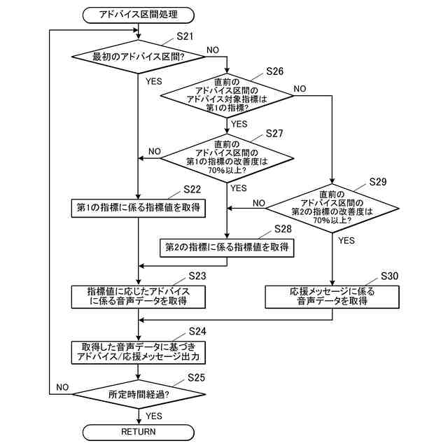 前記出力制御手段は、前記第1の区間において、前記第1の指標値が前記所定の条件を満たさなかった場合、次の第1の区間においても、前記第1の指標値に応じた前記アドバイスを前記出力部に出力させる、