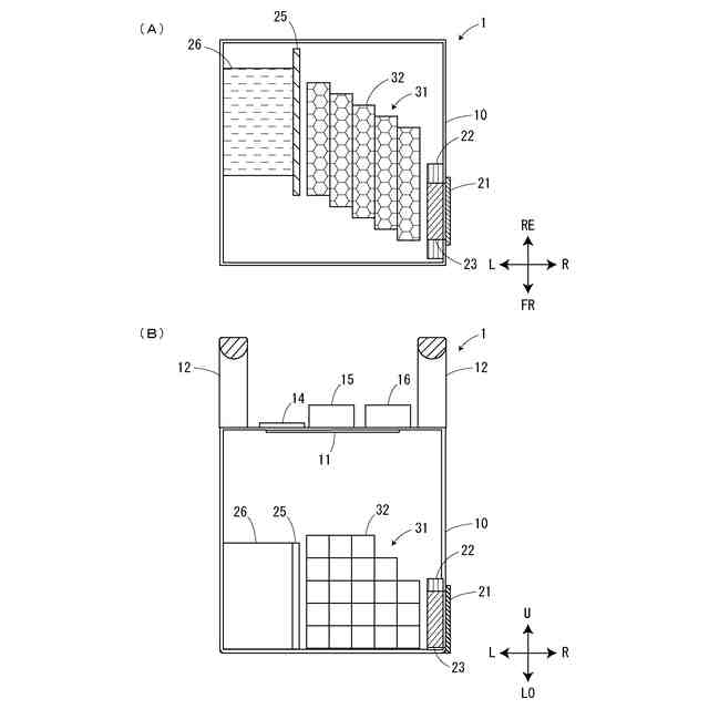 以下、本実施形態のRI計測装置について説明する。図1は本実施形態のRI計測装置の上面図及び側面図である。図2は本実施形態のRI計測装置の断面模式図である。なお、図2(A)は図1のRI計測装置をA-A線で切断した断面図であり、図2(B)は図1のRI計測装置をB-B線で切断した断面図である。各図に付される矢印FR、RE、L、R、U、LOは、それぞれRI測定器の前方、後方、左方、右方、上方、下方を示している。
