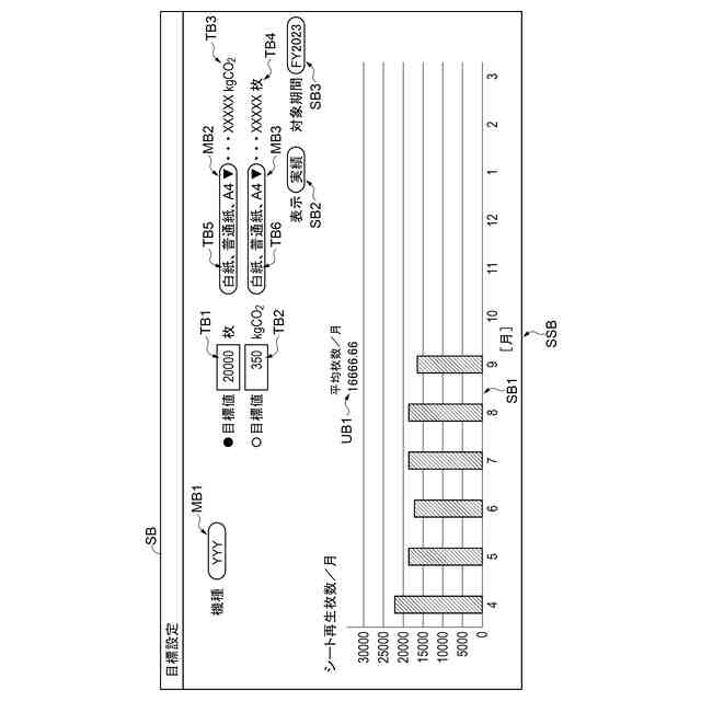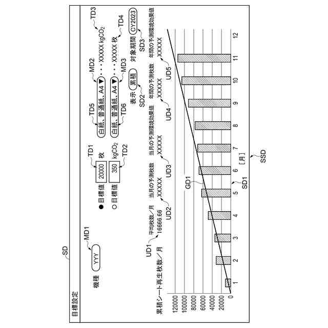 月毎のシート再生枚数のグラフ、シート種類による、目標枚数及び目標環境効果値とそれぞれの換算値を表示する第2画面の模式図。
