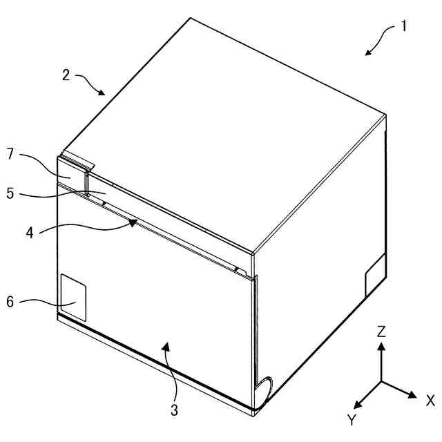本体ケース2は、ボタン等の凹凸部を除き、全体として略直方体形状を成す。この本体ケース2の内部に記録紙Pが収容される。本実施形態の印刷装置1は、略直直方体形状の本体ケース2の向かい合う面が、X軸、Y軸、及びZ軸のそれぞれに沿って向かい合うように位置している。