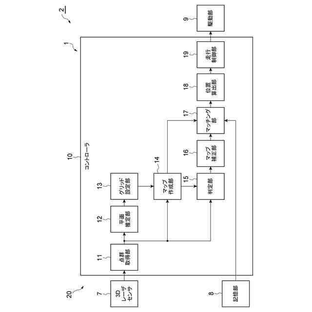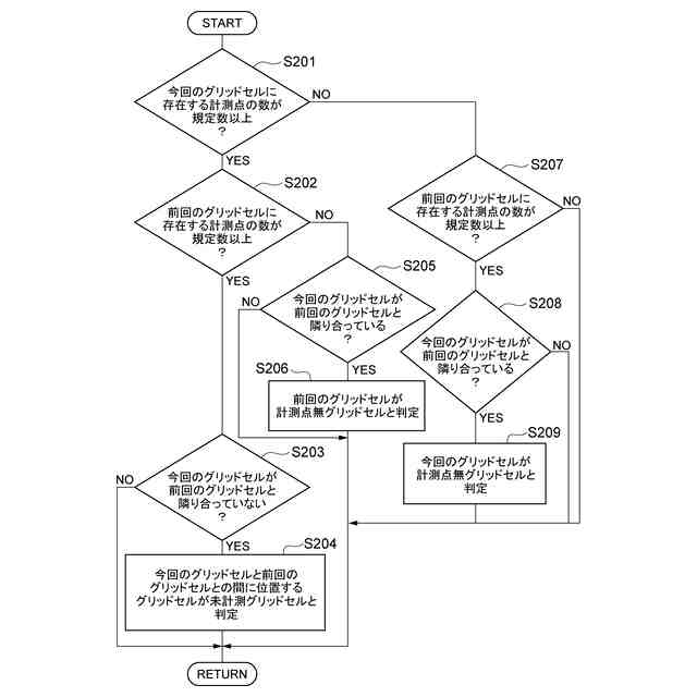 (3)上記の(1)または(2)において、判定部は、マップ作成部により作成された2次元マップに基づいて、未計測グリッドセルと、取得部により点群データが取得されたが計測点が存在しない計測点無グリッドセルとがあるかどうかを判定し、マップ補正部は、判定部により未計測グリッドセルがあると判定されたときは、未計測グリッドセルのグリッド値を補間することで、マップ作成部により作成された2次元マップを補正し、判定部により計測点無グリッドセルがあると判定されたときは、計測点無グリッドセルのグリッド値を補間しなくてもよい。