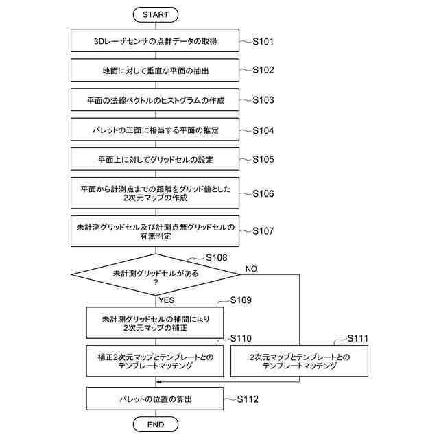 このような構成では、2次元マップとパレットの寸法を含むパレット情報に応じたテンプレートとをマッチングさせることにより、パレットの位置が更に精度良く検知される。