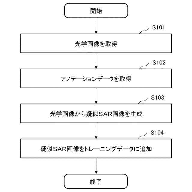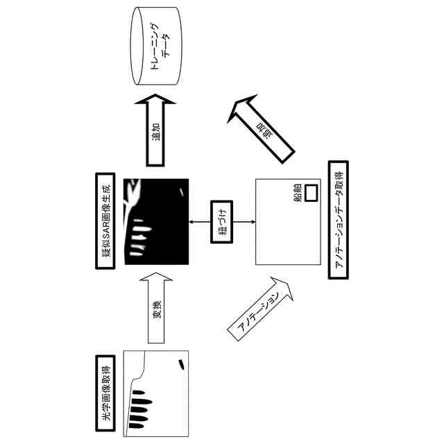 本開示の一態様におけるプログラムは、対象物が撮像された光学画像を取得し、光学画像に対して付与された、対象物に関するアノテーションデータを取得し、変換処理によって、光学画像からSAR画像を模擬した疑似SAR画像を生成し、疑似SAR画像を、アノテーションデータと紐づけて、トレーニングデータに追加する処理をコンピュータに実行させる。