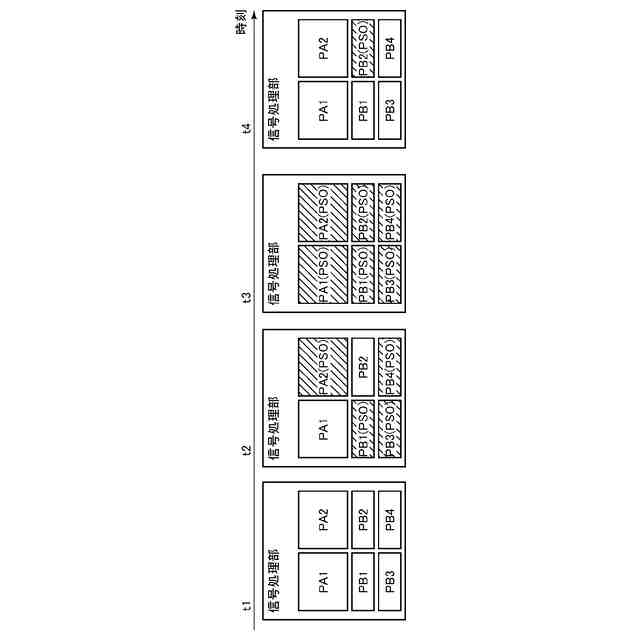 第1実施形態に係る半導体装置における処理回路の状態の時間変化を示す平面模式図である。