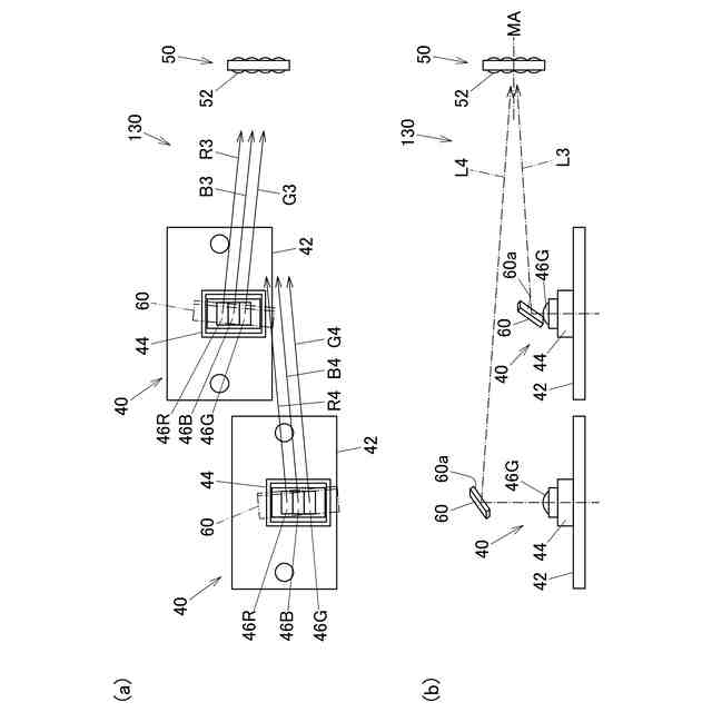 【解決手段】光源装置30は、複数の発光素子46R、46B、46Gが列状に配列された発光部44を含む発光モジュール40と、入射面にマトリクス状に配列された複数のマイクロレンズ52を含むマイクロレンズアレイ50と、を備え、入射面において、複数の発光素子46R、46B、46Gから出射されたレーザ光の複数の入射点の並び方向が複数のマイクロレンズ52の配列方向に対して傾斜するように配置されている。