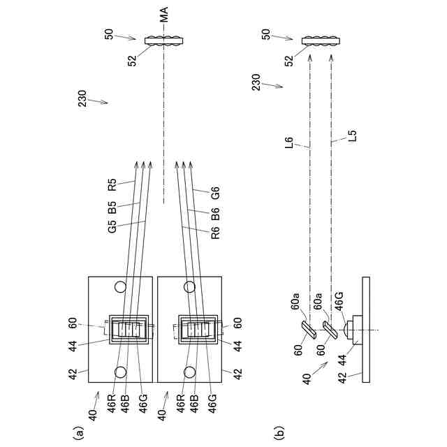 (a)は、第5実施形態に係る光源装置におけるレーザ光の出射態様を示す平面模式図であり、(b)は、第5実施形態に係る光源装置におけるレーザ光の出射態様を示す右側面模式図である。