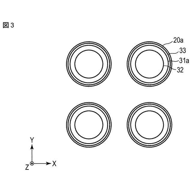 複数の積層構造10は、下部構造30上に設けられており、X方向及びY方向にアレイ状に配置されている。各積層構造10は、複数の層がZ方向に積層された構造を有している。なお、X方向、Y方向及びZ方向は、互いに交差する方向である。具体的には、X方向、Y方向及びZ方向は、互いに直交している。