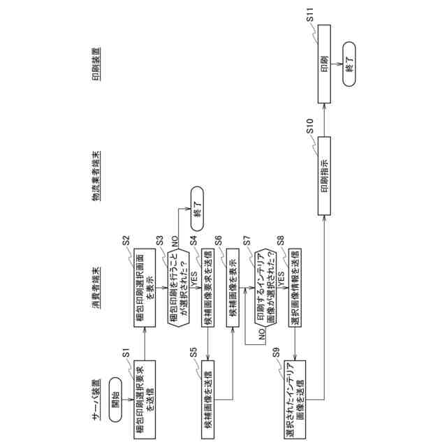 【解決手段】サーバ装置2の記憶部11は、複数のインテリア画像を記憶する。制御部13は、記憶部11に記憶されている複数のインテリア画像から、段ボール箱が配置される居住空間のデザインに応じたインテリア画像を特定し、特定したインテリア画像を、印刷装置5による段ボール箱へのインテリア画像の印刷を制御する物流業者端末4へ送信する。