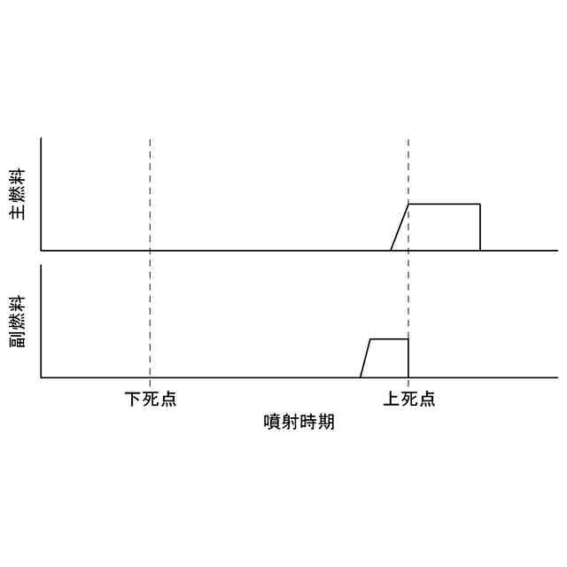 本発明の実施形態に係るエンジン装置における主燃料及び副燃料の噴射時期の例を示すグラフである。
