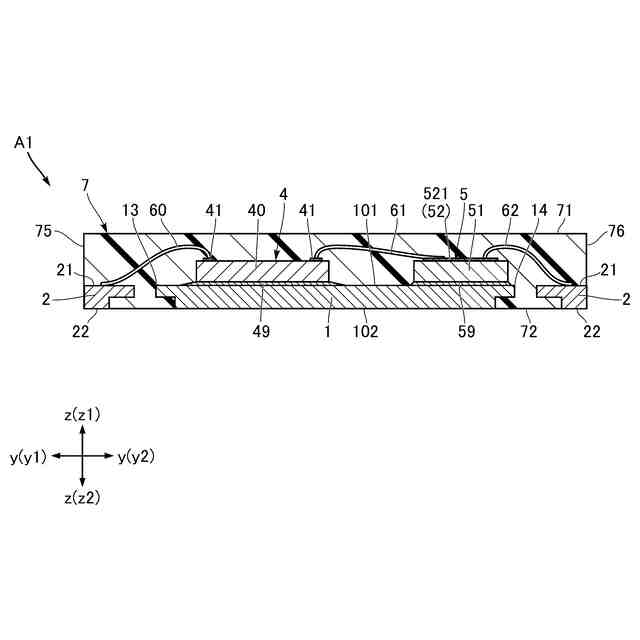 【解決手段】 半導体装置A1は、第1方向zの第1側z1を向く第1面101を有する第1リード1と、第1面101に搭載され且つ複数の電極41を有する半導体素子4と、半導体素子4に導通する第2リード2と、第1リード1および第2リード2の少なくとも一部ずつと半導体素子4とを覆う封止樹脂7と、を備え、絶縁層51および1以上の配線部521を含む導電層52と、電極41および配線部521に接続された第1ワイヤ61と、第2リード2に接続された第2ワイヤ62と、をさらに備える。電極41および第2リード2の導通経路に、第1ワイヤ61、配線部521および第2ワイヤ62が含まれる。