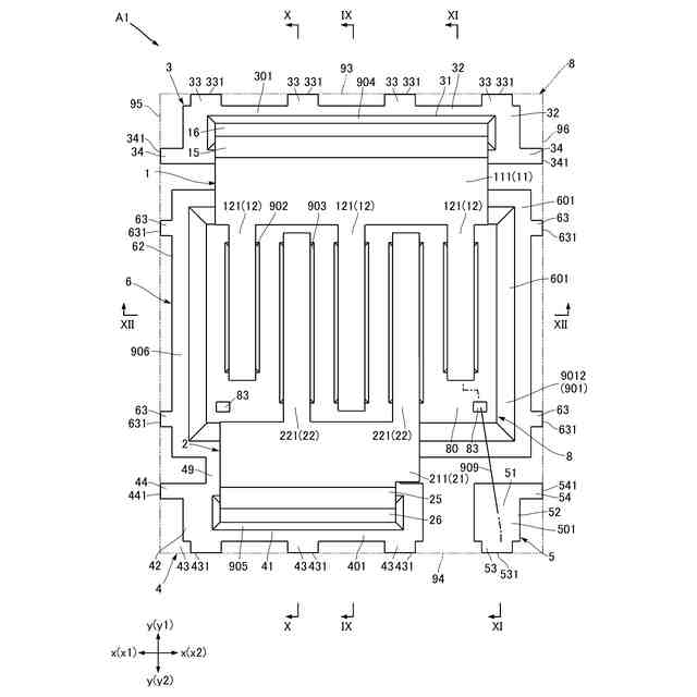 前記素子本体は、前記第1方向の第1側を向く素子主面、第2側を向く素子裏面および前記第1方向と交差する方向を向く1以上の素子側面を有し、
