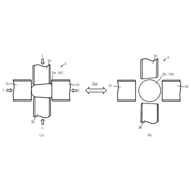 図3は、本発明の実施形態に係る熱処理鋼線の製造装置における圧延加工手段のロール形状、当該ロールの状態及び当該状態が切替可能であることを示す概念図であり、(a)は圧延加工の状態、(b)は圧延加工を終了した状態を示す概念図である。
