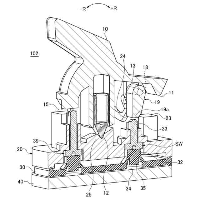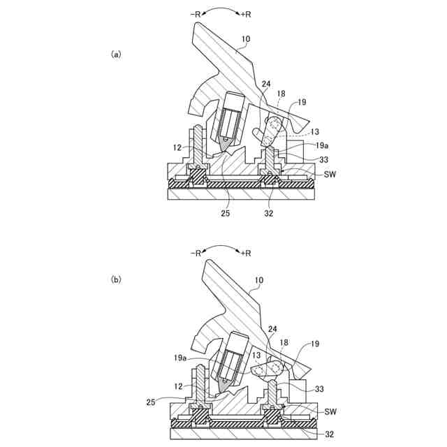 特許文献2のようなスイッチ装置としては、押下が解除されると、接点同士が離れて非導通状態となり、且つ、自身が有する弾性によって初期位置に自立復帰するものが主流である。一方で、電装品の動作状態を継続させたい場合、通常、接点同士を導通状態にしておく必要がある。
