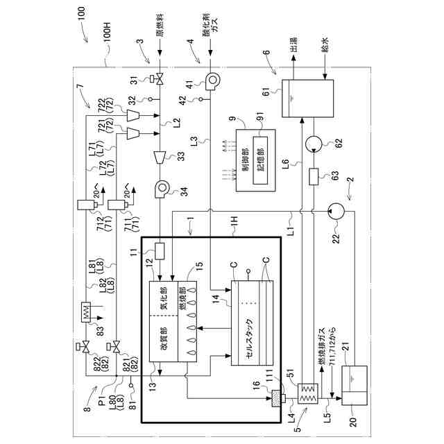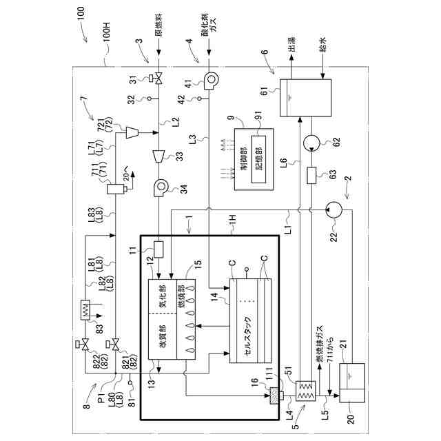 上記特徴構成によれば、第1流路よりも放熱性能が高い第2流路にガスを流通させるだけでホットモジュールから排出されるガスの温度を低下させて、水分回収部での水分の回収量を増加させ、ガスに含まれる水分量を低減することができる。したがって、簡素な構成でホットモジュールから排出されるガスに含まれる水分量を低減させることができる。