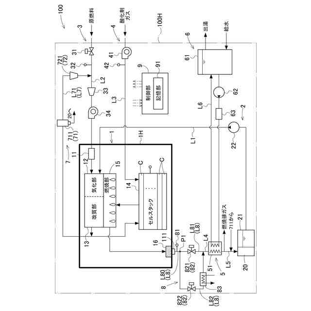 上記特徴構成によれば、第2流路の長さを第1流路の長さよりも長くするだけで、ホットモジュールから排出されるガスの温度を低下させて、水分回収部での水分の回収量を増加させ、ガスに含まれる水分量を低減することができる。したがって、簡素な構成でホットモジュールから排出されるガスに含まれる水分量を低減させることができる。
