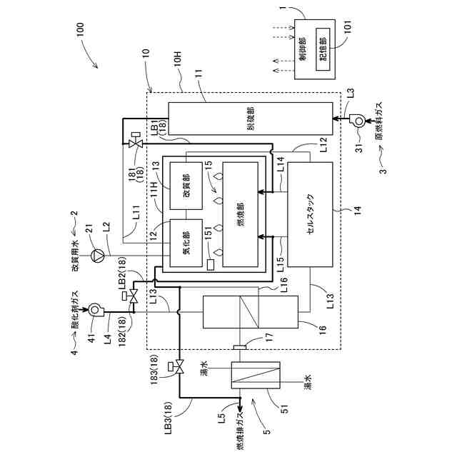 【解決手段】燃料電池システム100は、セルスタック14、改質部13、燃焼部15、アノードオフガス供給路L14、カソードオフガス供給路L15、及び、燃焼排ガス路L16を有するホットモジュール10と、燃焼排ガス路L16を流通する燃焼排ガスと冷媒とを熱交換する熱交換器51と、を備え、原燃料を、改質部13及びセルスタック14を迂回してアノードオフガス供給路L14に供給する原燃料バイパス路LB1と、酸化剤ガスを、セルスタック14を迂回してカソードオフガス供給路L15に供給する酸化剤ガスバイパス路LB2と、燃焼部15からの燃焼排ガスを、熱交換器51を迂回して燃焼排ガス路L16に供給する燃焼排ガスバイパス路LB3とのうち、少なくとも一つを備える。