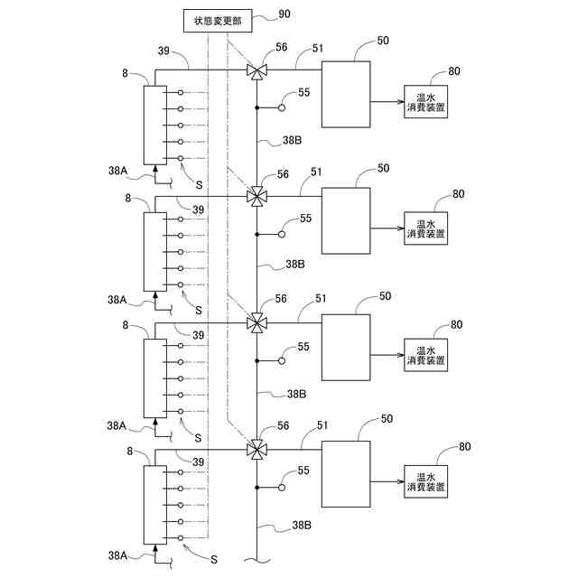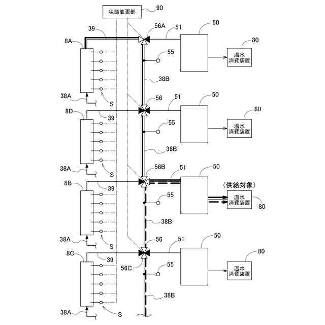前記第一消費部の要求に応じて前記複数の調節機構の状態を変更させることによって前記複数の蓄熱ユニットの少なくとも一つから前記第一消費部への前記湯水の供給を現出させる状態変更部と、が備えられ、