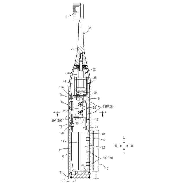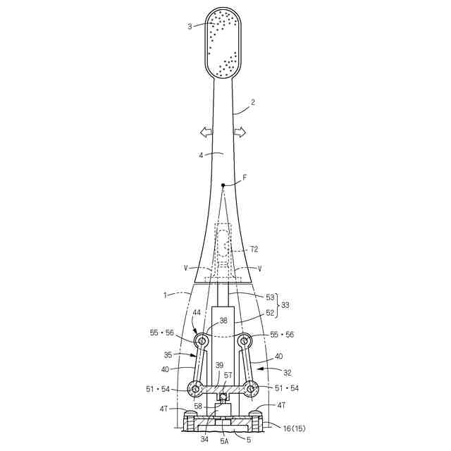 特許文献1の電動歯ブラシにおいて、揺動支点まわりにシーソー状に往復揺動運動するブラシ毛の振幅を偏心カムと長溝とで変換される往復振動の振動幅よりも小さくするためには、シーソー状に往復揺動運動する連結棒と歯ブラシ体との揺動支点(枠のネック部分)を、偏心カム(運動変換装置)とブラシ毛との間において、ブラシ毛寄りに近付けて設ける必要がある。しかし、連結棒に連結される歯ブラシ体は、口内の奥部まで挿入できる長さが必要であるため、歯ブラシ体の全長の短縮化には限界があり、必然的にネック部分から偏心カムまでの距離を大きくせざるを得ず、その分ケースが長大化して歯ブラシ体が大型化してしまう。