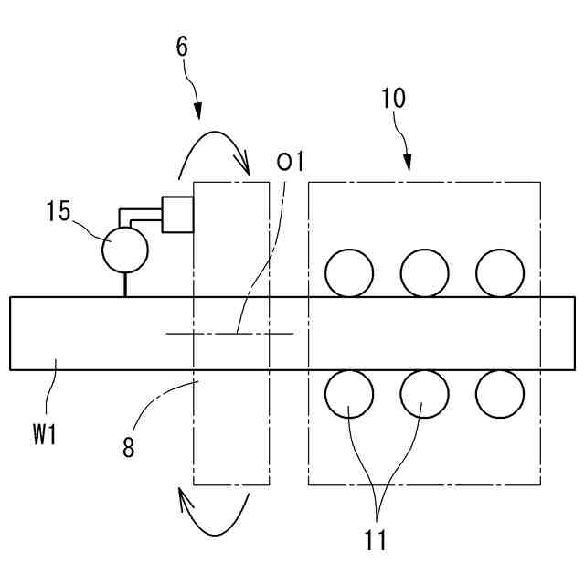 棒状の鋼材(以下、単に棒材を称する)を製造する過程において、ピーリングマシンを用いて棒材の外周面を切削することが行われている。図8は、従来公知のピーリングマシンの概略構成を模式的に示した図である。同図で示すピーリングマシン1は、棒材Wの搬送方向上流側から下流側に向けて、棒材Wを一定速で下流側に送り出す上流側搬送装置としてのフィードローラ2と、棒材Wの外周面に沿って複数のガイドローラ5を備え棒材Wをセンタリングすると共に切削反力を支持する上流側ガイド支持装置4と、棒材Wの外周面に沿って、周方向に間隔を隔てて配置された複数の切削刃7を加工中心軸O1周りに回転させて棒材Wの外周面を切削する切削加工機6と、棒材Wの外周面に沿って複数のガイドローラ11を備えて棒材Wをセンタリングすると共に切削反力を支持する下流側ガイド支持装置10と、下流側搬送装置としてのキャリッジ12とがこの順で配置されている。キャリッジ12は、棒材Wの後端がフィードローラ2を通過することによって搬送できなくなったとき、棒材Wを挟んで搬送方向下流側に引き出すものである。このような構成のピーリングマシンは例えば下記特許文献1に記載されている。
