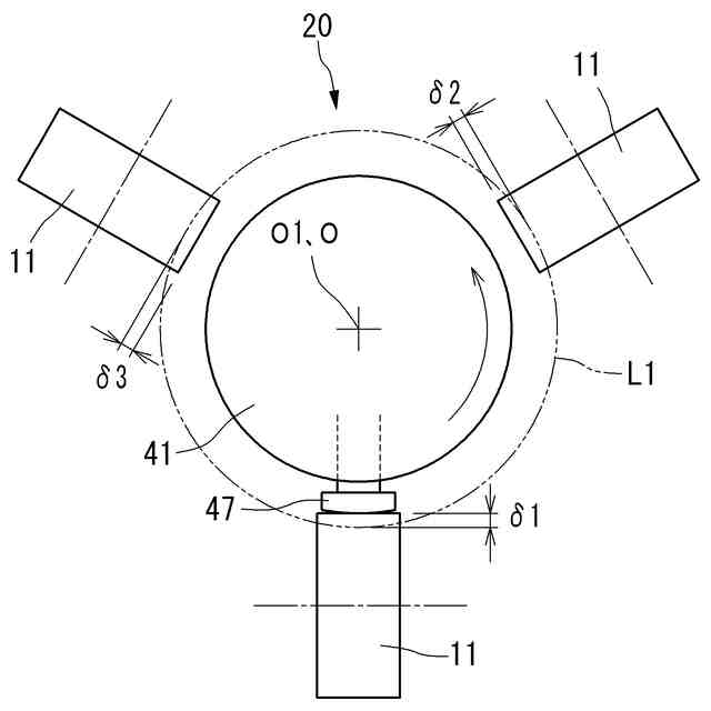 このようなピーリングマシン1において加工後の棒材Wの真円性を高めるためには、切削加工機6における回転軸(加工中心軸O1)と、ガイド支持装置4,10におけるガイドローラ5,11によりセンタリングされる棒材Wとの芯ずれを抑える必要があるところ、各ガイドローラ5,11の摩耗が不均等であった場合には、充分な芯出し状態を維持できなくなってしまう虞がある。特に重要なのは下流側ガイド支持装置10における芯出し状態である。