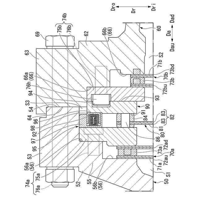 前記スペーサには、前記軸線方向に凹み、前記バネカバーの一部が入り込む凹部が形成されている、