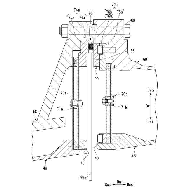 前記複数の第三シール組品毎の前記内側枠は、前記第一外側ディフューザの前記軸線下流側の端に溶接で固定されている、