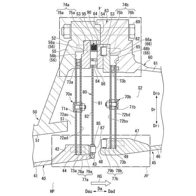 第一環状シール装置は、第一外側ディフューザと排気車室と間への排気ガスの流入を抑制できるよう、第一外側ディフューザの軸線下流側の端部から排気車室の軸線下流側の端部にかけて設けられている。すなわち、第一環状シール装置は、排気車室の内周側と第一外側ディフューザの外周側との間の第一外側空間と、排気流路との間をシールする役目を担っている。第二環状シール装置は、第二外側ディフューザと排気室と間への排気ガスの流入を抑制できるよう、第二外側ディフューザの軸線上流側の端部から排気室の軸線上流側の端部にかけて設けられている。すなわち、第二環状シール装置は、排気室の内周側と第二外側ディフューザの外周側との間の第二外側空間と、排気流路との間をシールする役目を担っている。