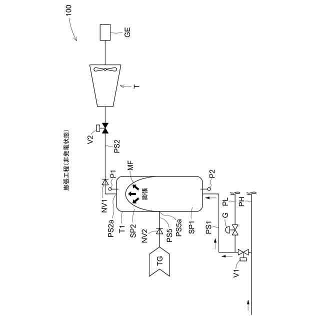 【解決手段】袋膜内部SP1を一時貯留槽T1へ受け入れられる対象ガスTGの圧力以上の高圧力の流体が通流する高圧導管PHに連通接続可能に構成し、タービンTの回転動力により発電可能な発電機GEを備え、貯留空間SP2に対象ガスTGが存在する状態で、袋膜内部SP1と高圧導管PHとを連通させる膨張工程を実行すると共に、膨張工程にて昇圧された貯留空間SP1の対象ガスTGを、一時貯留槽T1の吹出部PS2aから吹出してタービンTを回動させる形態で発電機GEにて発電する制御装置を備える。