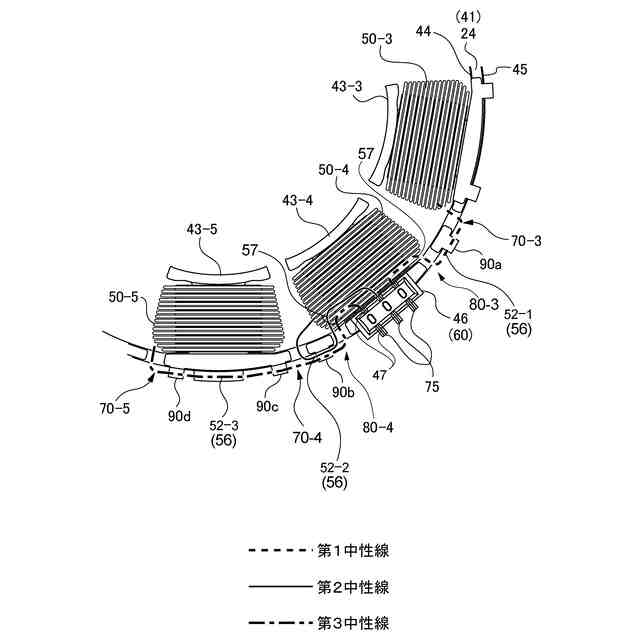 前記3本の中性線のそれぞれは、前記外壁部から外径側に引き出された外周側導線部と、前記外壁部から内径側に引き込まれた内周側導線部とを含み、前記内周側導線部の一端が前記端子と電気的に接続される。